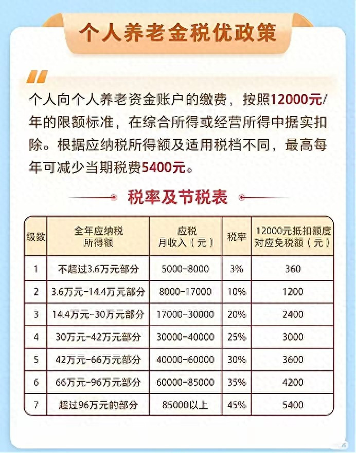 举个例子更直观:假设你年收入20万,对应的个税税率是20%。如果你今年缴存了1.2万个人养老金,这1.2万在计算个税时可以直接扣除,相当于少交2400元税(12000×20%)。而等到退休领取时,这1.2万只需要按3%交税,也就是360元。一来一回,相当于国家帮你补贴了2040元。如果收入更高,税率达到25%,省下的税就高达3000元(12000×25%),退休时只需交360元,净赚2640元。这种"现在少交税,未来低税率"的设计,对高收入群体来说简直是"双重福利"。